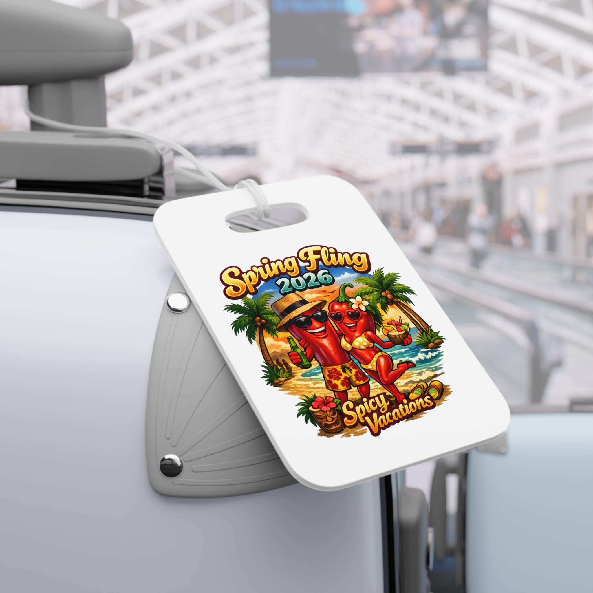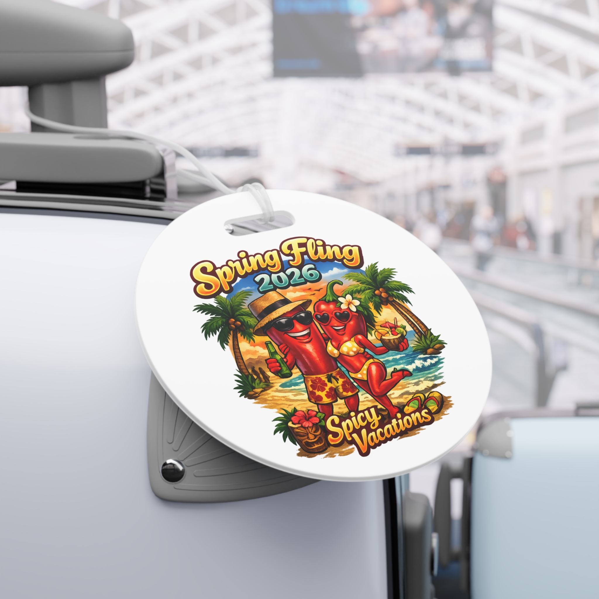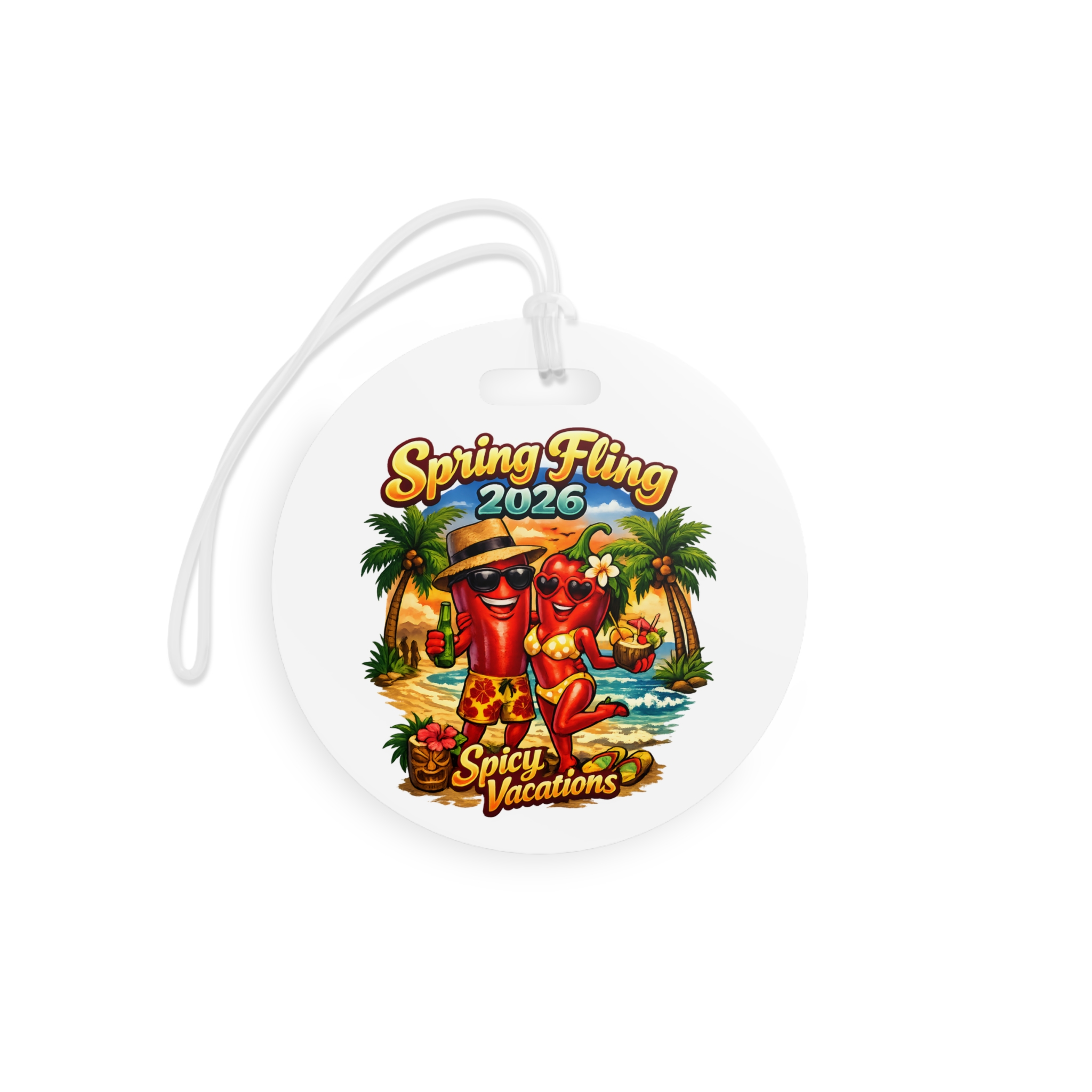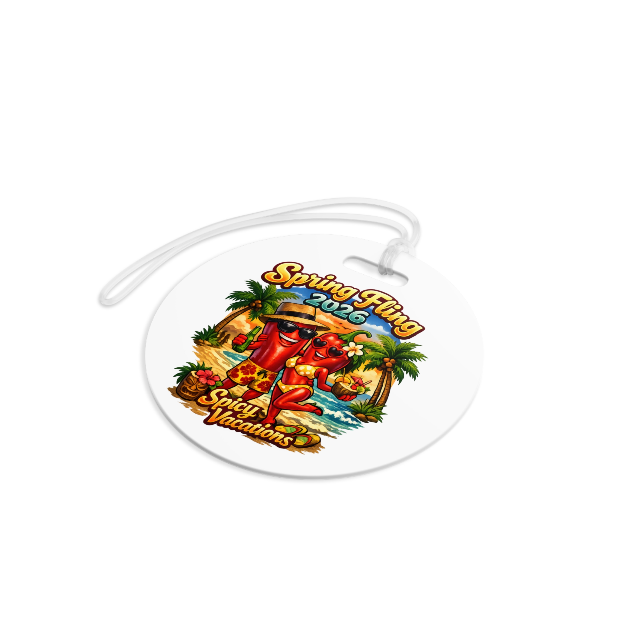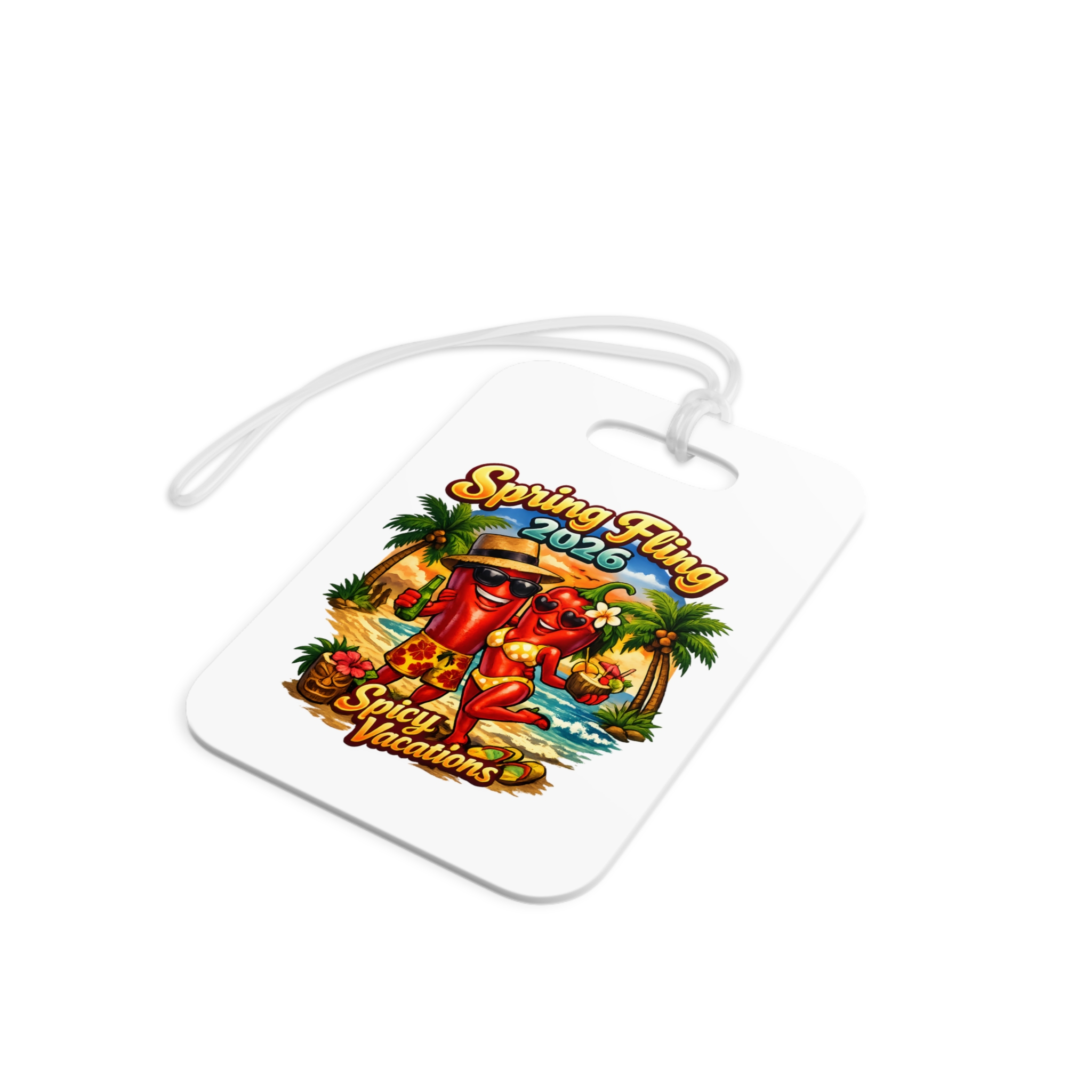 Add a little spice to every adventure with these bold, vibrant luggage tags. Perfect for swinging couples and free spirits, these glossy plastic tags flaunt double-sided prints that stay bright and crisp no matter how wild the journey gets. The flexible clear acrylic tie slides easily through handles and straps, keeping your tag secure while you jet between beach parties, resorts, and spontaneous escapes. Choose round or rectangle shapes to match your style — each ships individually and is proudly assembled in the USA from globally sourced parts. The lively, tropical-themed design in the photos sets the mood for flirtatious getaways, playful spring breaks, and sexy seaside vacations.